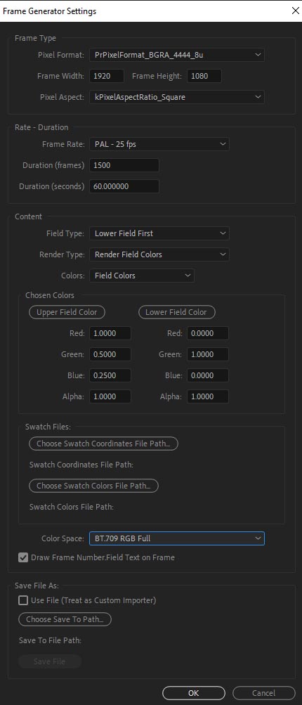 Выполняем команду: File > New > Frame Generator Test Tool... В окне New Synthetic выбираем разрешение и нажимаем на кнопку: OK. Далее, загрузится окно Frame Generator Settings.