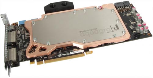 Компания Aqua Computer GmbH предлагает комплект из видеокарты Gigabyte GeForce GTX 570 c 1.28Гб памяти и предустановленного медного радиатора montiertem aquagraFX для подключения к системе водяного охлаждения.