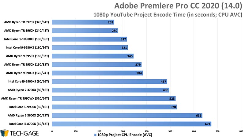 И вот свежий тест процессоров от techgage.com, показывает что дело не в Adobe Premiere Pro CC 2021, на скрине видно, что самый "сложный" тест (в плане чем меньше разрешение, тем меньше ресурсов как правило утилизируется) - кодирование в 1080p пресет YouTube. 32-ядерный AMD Ryzen Threadripper 3970X обходит в 2 раза!!! 32-ядерный AMD Ryzen Threadripper 2990WX.