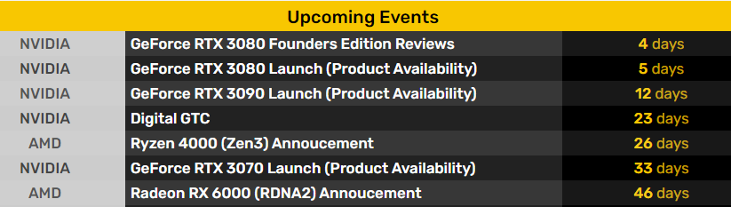 Сайт VideoCardz выпустил напоминалку, когда ждать выхода новых продуктов и снятие NDA на обзоры. Забыв про компанию Intel, у которой то же много чего нового будет в октябре месяце. Начиная с процессоров TGL-U, графики DG1 и выхода NUC.