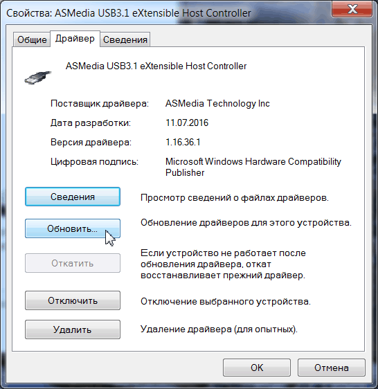 Выполняем: Пуск > Устройства и принтеры, и там на значке ПК, нажимаем правую кнопку мыши и выбираем пункт Свойства. В окне Свойства, переключаемся на закладку оборудование. Выделяем пункт: ASMedia USB3.1 eXtensible Host Controller. Состояние: Устройство работает нормально. Нажимаем на кнопку: Свойства.
