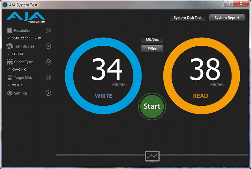 AJA System Performance Tester 2.1. Разрешение: 3840х2160 Ultra HD. Размер файла: 512 Мбайт. Кодек: XAVC-4K. Результат в Мб/с.