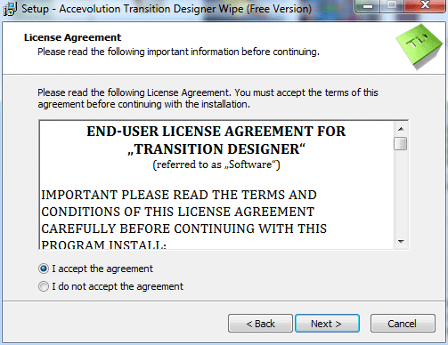 Запускаем скачанный с официального сайта (shopen.accevolution.de) файл TransitionDesignerWipe-1.5.0.exe. В окне Setup – Accevolution Transition Designer Wipe (Free Version), нажимаем на кнопку: Next >