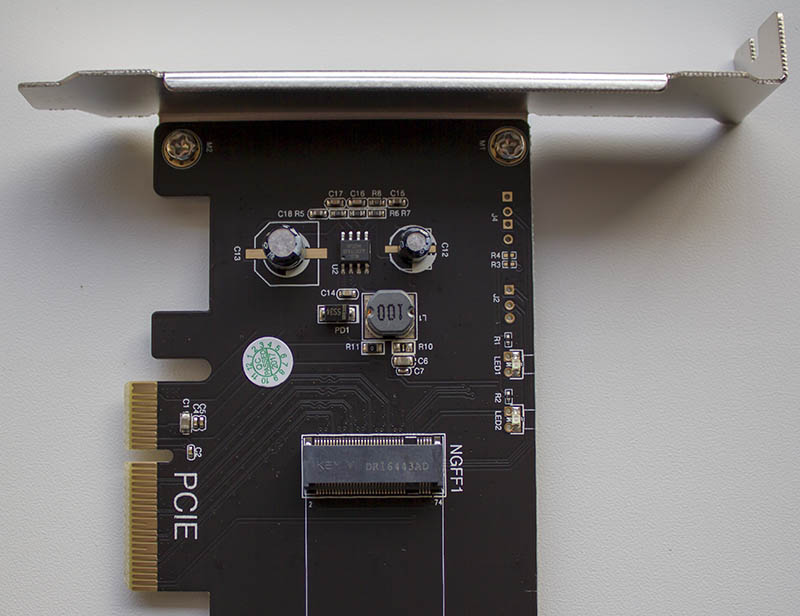 Адаптер OCZ ADSSD-PCI-M2-GR с M.2 слотом с вертикальным M Key, поддерживаются только PCIe SSD диски (диски с интерфейсом SATA не поддерживаются).