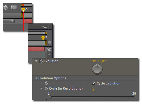Для анимации и зацикливания движения воспользуемся параметром Evolution. Ставим галку перед пунктом Cycle Evolution. Далее, размещаем индикатор текущего времени в самое начало и включаем будильник у параметра Evolution. Перемещаем индикатор текущего времени в самый конец и увеличиваем значение Evolution на 4х цикла.