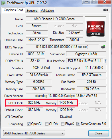 Тестируем видеокарту Gigabyte GV-R785WF2-2GD, которая построенная на чипсете AMD Radeon HD 7850 (Pitcairn Pro), технические характеристики отображаемые с помощью информационной утилиты GPU-Z: