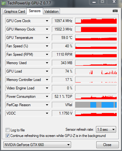 Загрузка видеокарты Gainward GeForce GTX 660 2048MB GDDR5: 74% (работала в Boost режиме) и 343 Мбайт, при экспорте проекта из программы Adobe After Effects.