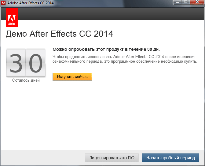 Демо After Effects CC 2014: можно опробовать этот продукт в течении 30 дней. Нажимаем на кнопку: Начать пробный период.