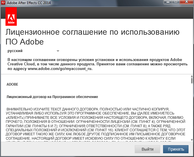 В очередной раз принимаем лицензионное соглашение для Adobe After Effects CC 2014.