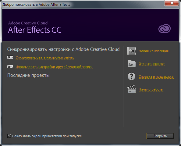 Заставка программы: Добро пожаловать в Adobe After Effects на русском языке.