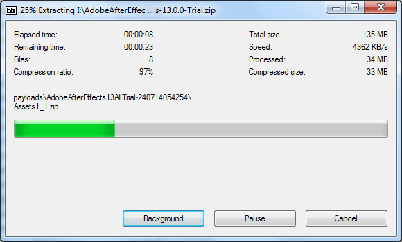 Идем в директорию сохранения апдейта и распаковываем скачанный архив AdobeAfterEffects-13.0.0-Trial: