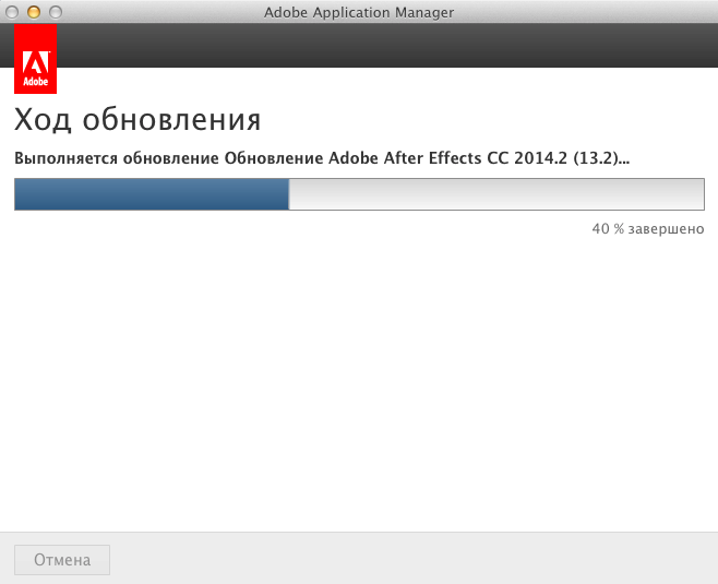 Ход обновления. Выполняется обновление Обновление Adobe After Effects CC 2014.2 (13.2)... На 93% будет продолжительная пауза (время зависит от того на чем установлена система на SSD/HDD).