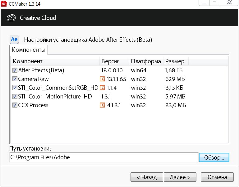 Настройки установщика Adobe After Effects Beta. Установка следующих компонентов: версия программы 18.0.0.10, STI_Color_MotionPicture_HD 1.3.1, STI_Color_CommonSetRGB_HD 1.1.4, Camera RAW CC 13.1.1.65, CCX Process 4.1.3.1. Нажимаем на кнопку: Далее >