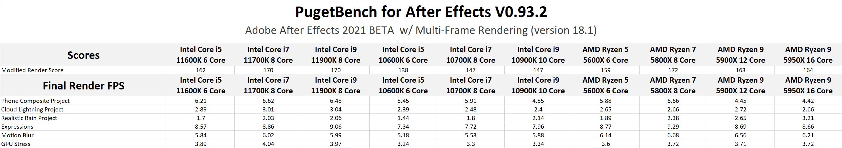 Чтобы увидеть, как работают новые процессоры Intel Core 11-го поколения в After Effects, мы сравним их не только с предыдущими процессорами Intel Core 10-го поколения, но и с серией AMD Ryzen 5000. Для самого теста мы будем использовать наш бенчмарк PugetBench for After Effects (0.93.2) и After Effects версии 18.0. Эта версия бенчмарка включает в себя возможность загружать результаты в нашу онлайн-базу данных, поэтому, если вы хотите сравнить ваш конфиг по производительности, вы можете скачать и запустить бенчмарк самостоятельно.