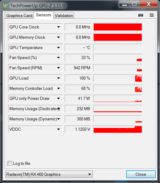 Когда к видеокарте AMD не подключен монитор, не отображаются частоты ядра и памяти и их температура, но все остальные параметры активны, загрузка AMD Radeon RX 460 при воспроизведении таймлайна доходила до 100%. При этом потребление GPU only Power Draw: 41.7 W.