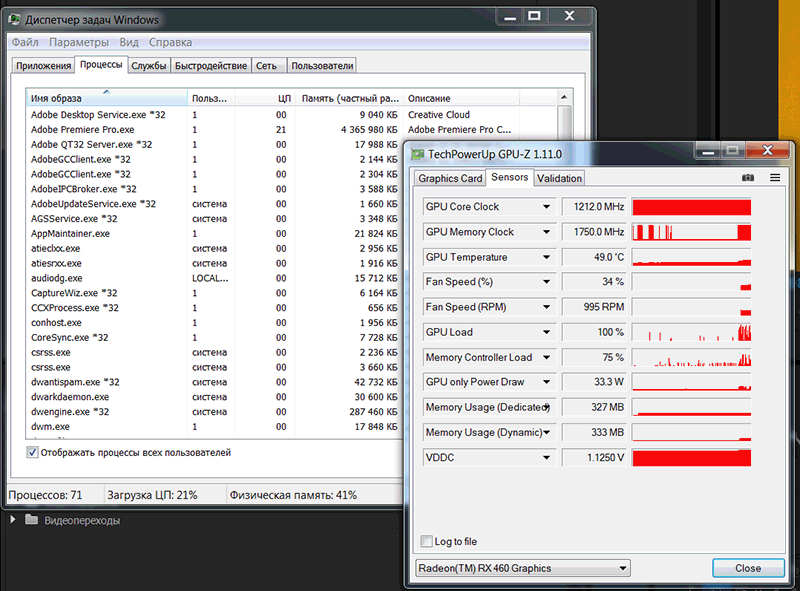 Загрузка процессора при этом минимальна, всего 21% и 4.4Гб оперативной памяти, загрузка чипсета видеокарты Gigabyte Radeon RX460 WINDFORCE OC 2G, доходила до 100%, при этом использовалось бортовой видеопамяти: 333Мбайта.