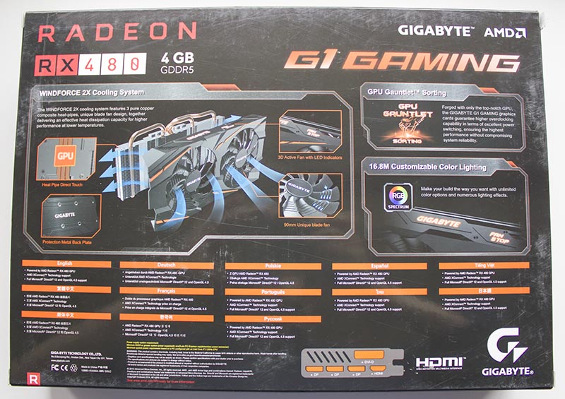 Также в рекламе отмечается, что для серии RX 480 G1 Gaming графические процессоры выбираются с помощью специального сортировочного процесса GPU Gauntlet. AMD Radeon RX 480 (или AMD Polaris 10) это четвертое поколение AMD GCN, произведенное по 14нм (FinFET) техпроцессу (у nVidia только чипсет GP107 произведен по 14нм техпроцессу на фабрике Samsung).