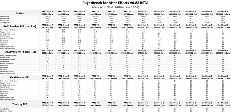 Поскольку After Effects CC 2020 обычно использует только несколько ядер процессора, существует только около 20% разницы в производительности между самым быстрым и самым медленным процессором, который мы тестировали. Достаточно интересно, что именно общая линейка продуктов определяет производительность, а не количество ядер, которые есть у каждого процессора. На самом деле, стоит отметить, что многие из более экономичных процессоров, таких как Intel Core i9-9900K или AMD Ryzen 9 3900X, отстают в пределах нескольких процентов от более дорогих процессоров, таких как 32-ядерный AMD Ryzen Threadripper 3970X.