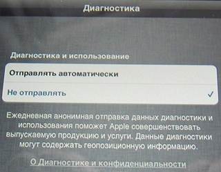 Диагностика и использование. Ежедневная анонимная отправка данных диагностики и использования поможет Apple совершенствовать выпускаемую продукцию и услуги. Данные диагности могут содержать геопозиционную информацию. Отказываемся от такого счастья: Не отправлять.