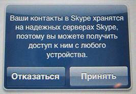 После входа в систему, отказываемся или принимаем чтобы ваши контакты в Skype хранились на надежных серверах Skype, так как вы можете получить к ним доступ с любого устройства.
