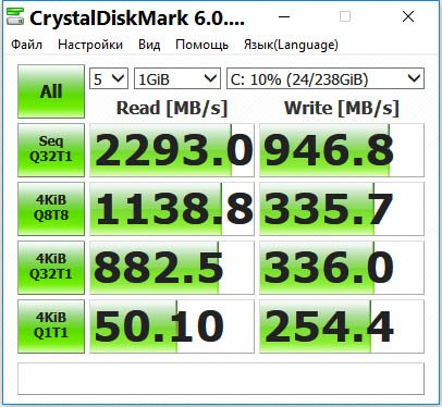Еще раз запускаем бенчмарк CrystalDiskMark 6.0.0 x64 и видим, что скорость чтения Seq Q32T1 для Samsung 950 PRO (MZ-V5P256BW) увеличилась с 1647 Мб/с до 2293 Мб/с.