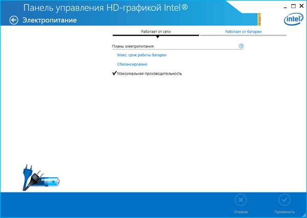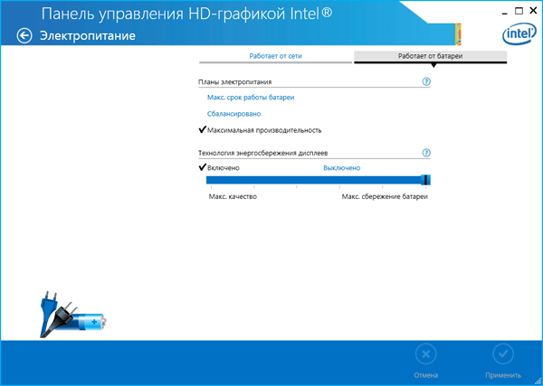 Раздел: Работает от батареи. Планы электропитания при работе от аккумулятора: Максимальный срок работы батареи, Сбалансировано, Максимальная производительность.