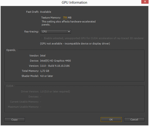 Adobe After Effects CC. После установки обновления After Effects CC (12.1) Update и выше, список intel_ogl_supported_cards.txt аннулирован, функция OpenGL теперь включена для всех интегрированных графических процессоров Intel, которые After Effects будет использовать для второго уровня функциональности GPU (Fast Draft, Hardware BlitPipe).