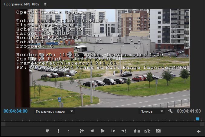 И как видим в окне Программа, включился движок: Аппаратное GPU-ускорение ядра Mercury Playback (OpenCL).