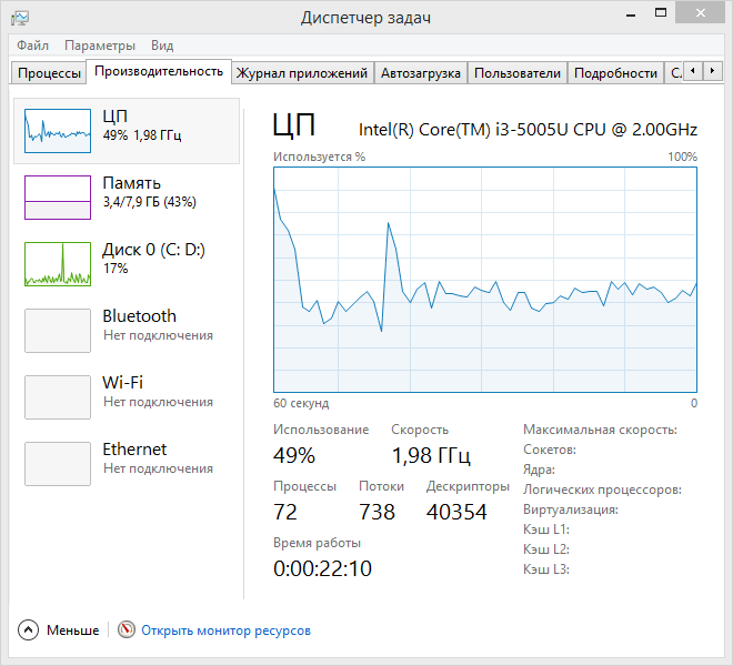 Загрузка процессора Intel Core i3-5005U составила 43%, ядра работали на полной частоте 1,98 ГГц.