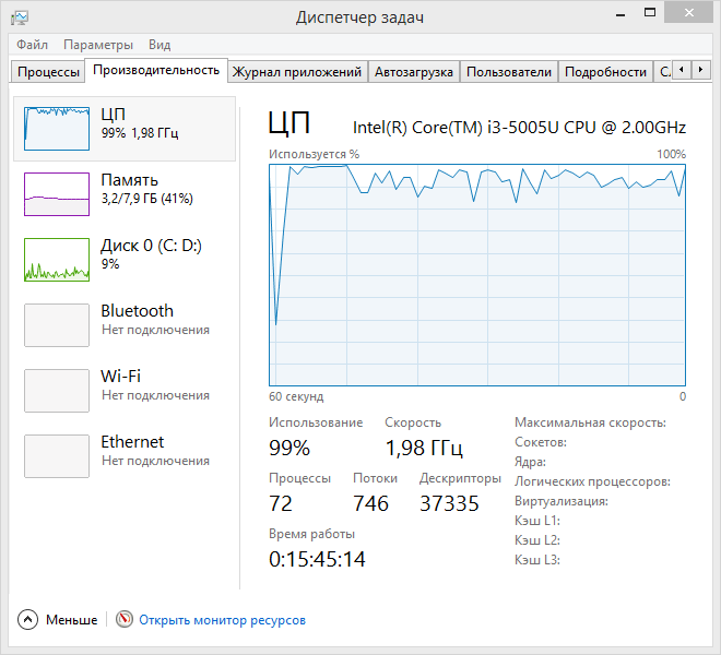 Загрузка двухъядерного процессора Intel Core i3-5005U составила 99%, ядра работали на полной частоте 1,98 ГГц.