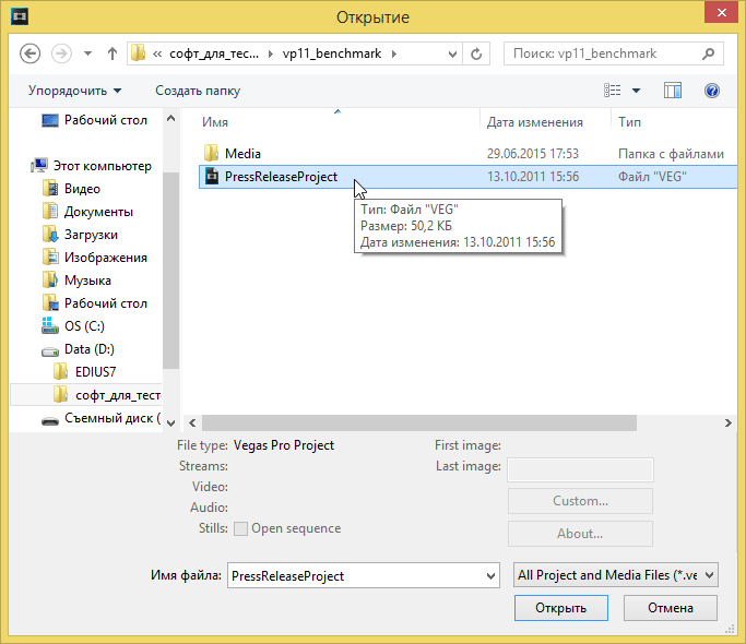 В окне: Открытие, выбираем проект PressReleaseProject.veg и нажимаем на кнопку: Открыть.