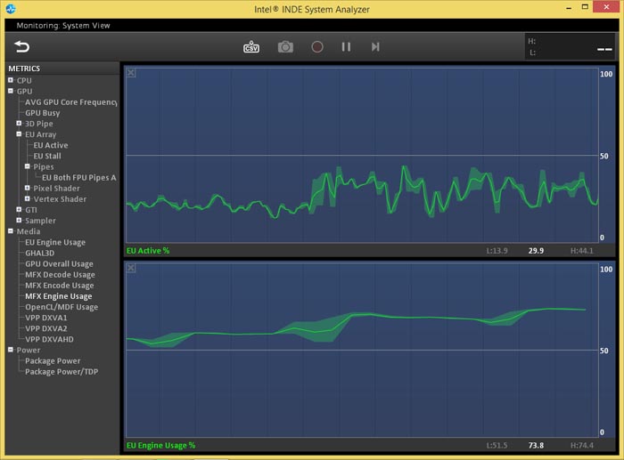 Загрузка исполнительных блоков (EU) отображаемая Intel INDE System Analyzer.