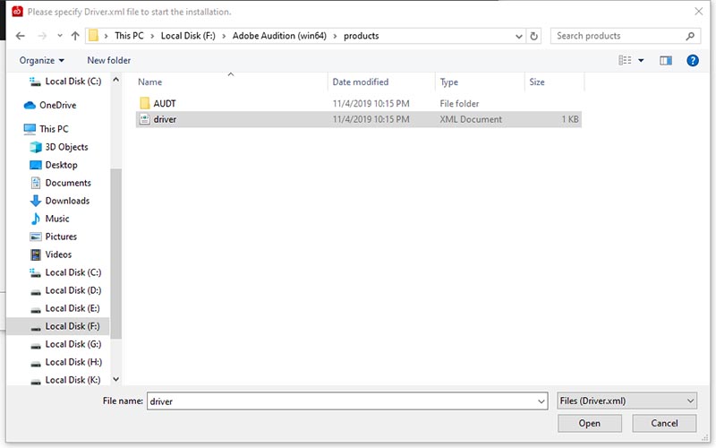 Указываем файл driver.xml для начала установки (ищем его в папке загрузки программы или обновления). Открыть.
