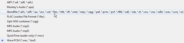 2. Расширенные опции экспорта в Audition CS6. Теперь вы можете импортировать и экспортировать любой формат, поддерживаемый с открытым исходным кодом libsndfile библиотеки (http://www.mega-nerd.com/libsndfile/), которая включает в себя целый набор аудио форматов файлов, от эзотерических до широко используемых: *.au, *.avr, *.caf, *.flac, *.htk, *.iff, *.mat, *.ogg, *.paf, *.pcm, *.pvf, *.rf64, *.sd2, *.sds, *.sf, *.voc, *.vox, *.w64, *.wve, *.xi (просто выбираем libsoundfile в качестве формата экспорта и нажимаем Change). Добавлена поддержка формата *.mp2, который еще активно используется на радио. Также появилась поддержка Monkey Audio формата: *.ape.