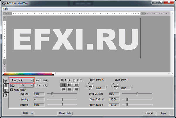 Запускаем программу Adobe After Effects CC 2019, создаем новую композицию и слой: Ctrl + N/Y. Применяем к слою эффект: Effect > BCC8 3D Objects > BCC Extruded Text. В настройках эффекта нажимаем на кнопку: Edit TEXT, вводим текст, выбираем шрифт и его размер, толщину Bold и нажимаем на кнопку: Apply.