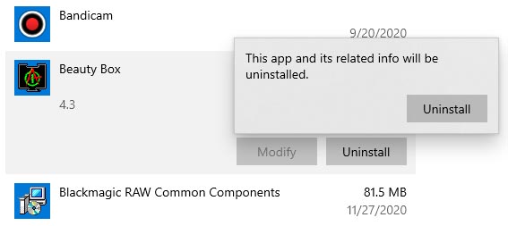 Digital Anarchy Beauty Box Video 4.3.0 Win деинсталлируется стандартными средствами Windows 10.