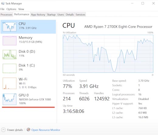 На втором скрине видно, что видеокарта также пока не активна, а процессор просаживается до 36%, так как производительность упёрлась в узкое место: дисковую подсистему. Загрузка 99-100%. Т.е. CPU ждёт данных от дисковой подсистемы. Утилизация оперативной памяти увеличилась до 83-85% (13.2 и 13.5ГБ).