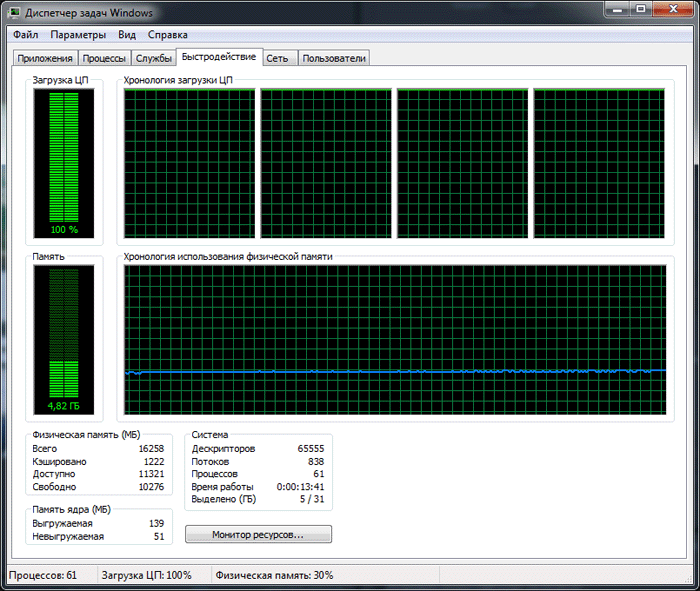 Загрузка центрального процессора без использования GPU поднялась до 100%.