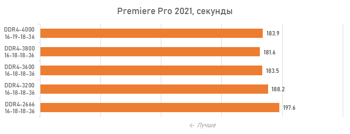 Вы самостоятельно можете разогнать базовую память DDR4-3200 (которая автоматически работает в сихронном режиме 1600-1600-1600) до частоты 3600МГц (1800-1800-1800) и выше, но с таймингами всё немного сложнее. Они хоть и незначительно, но также влияют на производительность в приложениях Adobe (это справедливо для AMD Ryzen 5000):