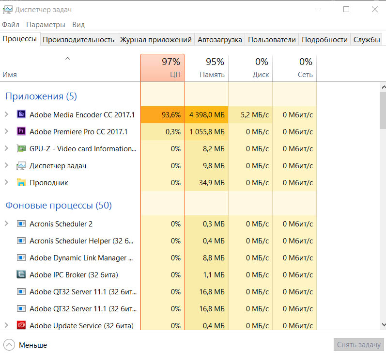 Процесс Adobe Media Encoder.exe грузит центральный процессор на 93.6%, и утилизирует 4.39Гбайт оперативной памяти DDR3-1600.