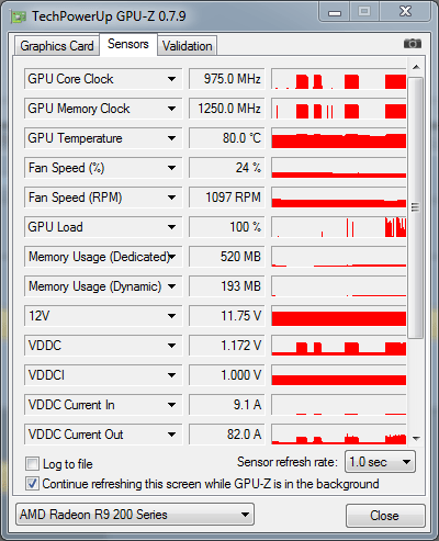 Загрузка Power Color AXR9 290 4GBD5-MDH/OC при проигрывании таймлайна в Full качестве, достигает 100% и 520 Мбайт бортовой видео памяти GDDR5.