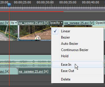 Можно регулировать плавность входа и выхода из затемнения, либо установкой дополнительных ключевых кадров, либо работая с кривыми Безье. Нажимаем правую кнопку мыши и из выпадающего списка выбираем пункт: Ease In.