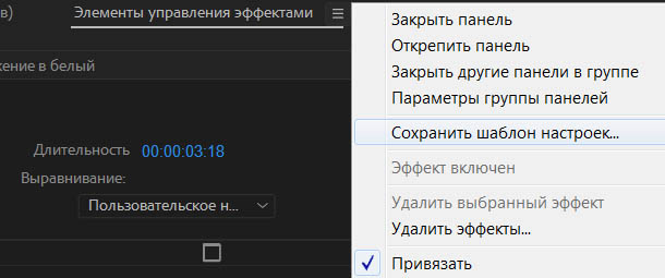 Настраиваем переход, потом нажимаем левую кнопку мыши на заголовке панели Элементы управления эффектами (Effect Controls) и выбираем пункт: Сохранить шаблон настроек (Save Preset).