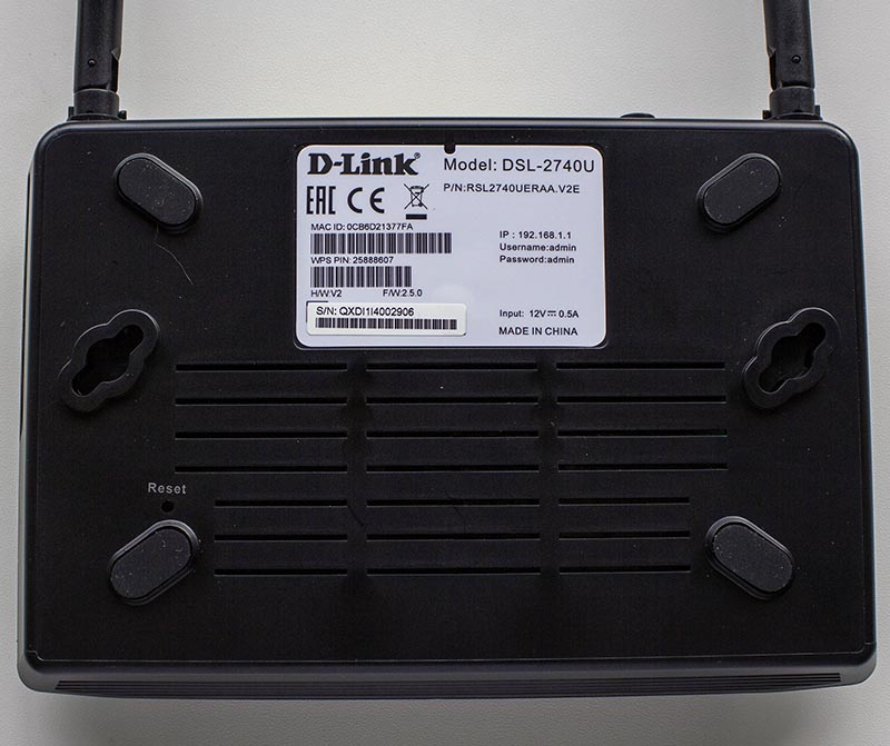 Кнопка Reset (для возврата к заводским настройкам) на дне ADSL модема, там же два крепления, для настенной установки и наклейка с важной информацией о устройстве.