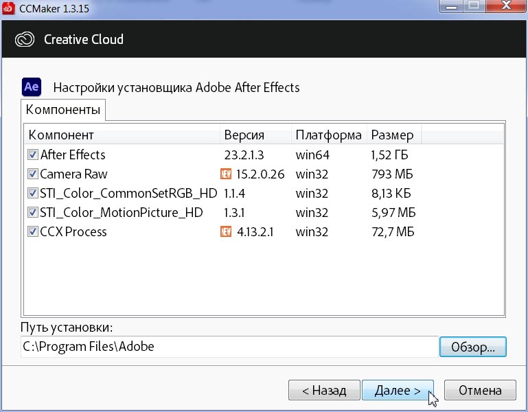 Настройки установщика Adobe After Effects. Установка следующих компонентов: версия программы 23.2.1.3, STI_Color_MotionPicture_HD 1.3.1, STI_Color_CommonSetRGB_HD 1.1.4, Camera RAW CC 15.2.0.26, CCX Process 4.13.2.1.