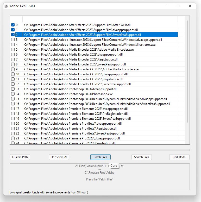 !!! Чтобы была возможность откатиться, у оригинальных длл-ок добавьте окончание .bak (GenP делает это автоматом). Все они находятся в корневой папке программы: C:\Program Files\Adobe\Adobe After Effects 2023\Support Files.