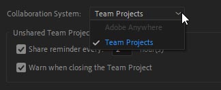 Система совместной работы: (Collaboration System:) – в выпадающем списке доступно два пункта: Adobe Anywhere и Проекты группы (Team Projects).