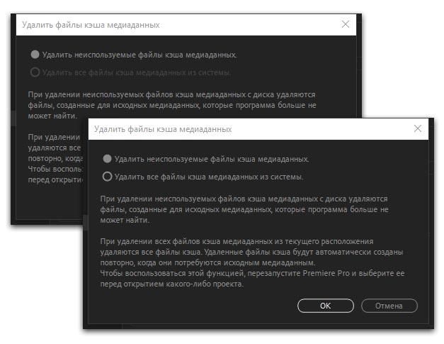 *Пункт: Удалить все файлы кэша медиаданных из системы (Delete all media cache files from the system) может быть не активен, если кнопку Удалить... (Delete...) нажимать при открытом проекте. Закройте все проекты и после этого оба пункта будут активны.