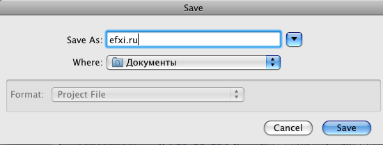 Сохраняем проект: File > Save Project As... (Shift+Cmd+S), вводим название проекта, выбираем директорию и нажимаем на кнопку: Save.