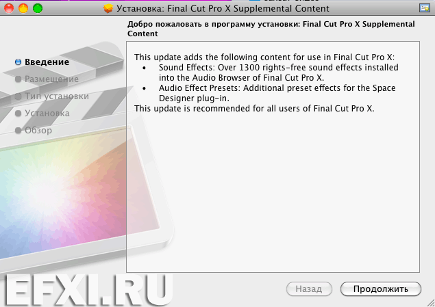 Устанавливаем дополнительный контент. Делаем двойной клик по образу DMG. В окне Установка: Final Cut Pro X Supplemental Content, нажимаем на кнопку: Продолжить.
